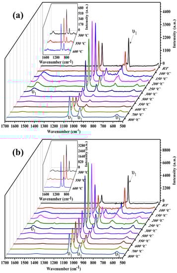 To investigate the structural transformation during CO2 uptake by carbonate–doped Na4SiO4, samples of 10(LiNa)90Na and 10(LiNaK)90Na were used as representatives characterized by in situ high–temperature Raman. Figure 4 shows the in situ Raman results measured from room temperature to 800 °C in an atmosphere containing 80 vol% CO2 in the wavenumber range of 500 to 1700 cm−1. These Raman–type peaks contained two fundamental vibrational modes: υ1–symmetric stretching vibrations and υ3–asymmetric stretching vibrations, associated with CO32−, C2O52−, SiO32− and SiO44− ions [34,39,40,41,42]. At ambient temperature, it was detected that typic peaks at 823 cm−1 related to the υ1 mode of Si–O in Na4SiO4 [41], and 1078 cm−1 were related to the υ1 mode of C–O in alkali carbonates [34]. When the temperature was above 100 °C, the peak of υ3 mode at 609 cm−1 and υ1 mode at 962 cm−1 of Si–O in Na2SiO3 [39,40,42] appeared, and the intensities strengthed gradually. Additionally, the peak intensity of υ1 mode at 1078 cm−1 related to C–O also exhibited a trend of gradual enhancement due to the product, Na2CO3. Correspondingly, the peak intensity of υ1 at 823 cm−1 related to Na4SiO4 showed a weakening trend. The peak at 1580 cm−1, related to the υ1 mode of the specie C2O52−, was detected from 150 °C. These results indicate that the added alkali carbonates can exhibit significant promotion from 100 °C. Additionally, at temperatures below 300 °C, no melt was present in the mixtures. This suggests that the pyrocarbonates can be emerged from solid carbonates and replace CO2 to react with Na4SiO4, expressed as Equation (3).