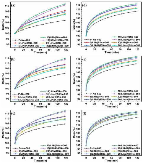 To explore the positive influence of solid carbonates in different quantities on the CO2 sorption capacity of Na4SiO4, isothermal experiments were conducted at 200–300 °C for 120 min under an atmosphere containing 80% CO2, and the results are shown in Figure 5a–c. The weight gain of all samples at different temperatures and the conversion of Na4SiO4 contained therein were listed in Table S1. The sorption capacity of all samples increased with increasing temperature. It was determined that the rate and adsorption capacity of CO2 capture by Na4SiO4 were significantly enhanced at different temperatures due to the mixed alkali carbonates. At the same addition ratio, the improvement of Li2CO3–Na2CO3 seemed to be relatively close to that of Li2CO3–Na2CO3–K2CO3, and samples containing Li2CO3–Na2CO3 exhibited slightly better chemisorption. Among sorbents, 10(LiNa)90Na had the best CO2 capture performance at 200–300 °C. The weight gain of 10(LiNa)90Na after sorption at 300 °C for 120 min was 13.3%, corresponding to = 58.6%. Under the same conditions, the weight gain of sample P–Na was 7.9%, corresponding to = 33.1%. However, the performance became worse when the carbonate content was doubled to 20 mol%.