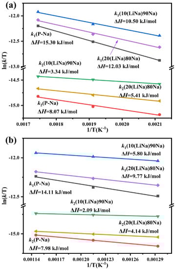 To provide further discussion on the temperature dependence of alkali carbonates at 200–300 °C on CO2 capture by Na4SiO4, the activation energies of chemisorption and bulk diffusion for P–Na, 10(LiNa)90Na, and 20(LiNa)80Na were simulated according to the Eyring’s model [14] expressed as Equation (5), in which k denotes the reaction rate constant, i.e., k1 and k2 above. t denotes the absolute temperature in units of K−1. R is the gas constant 8.314 J·mol−1·K−1. kB is the Boltzmann constant 1.380649 × 10−23 J·K−1. h is the Planck constant 6.62607015 × 10−34 J·s. ΔH++ and ΔS++ represent the activation enthalpy and activation entropy, respectively, which can be fitted to obtain