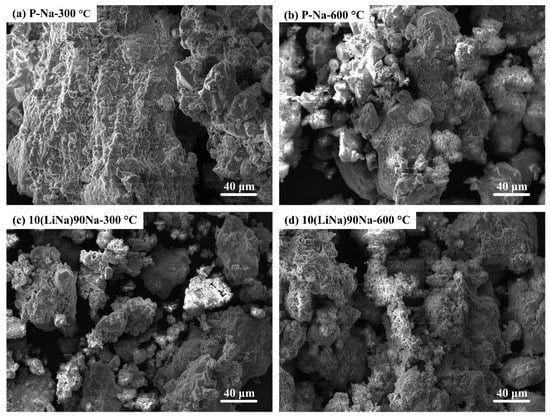 SEM images of P–Na and 10(LiNa)90Na after isothermal sorption at 300 °C and 600 °C.