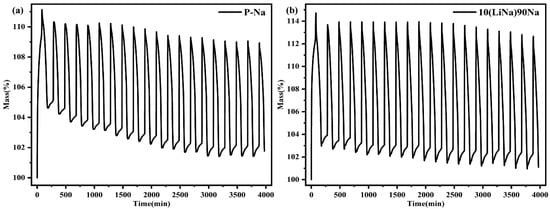 Multiple absorption–desorption cycles were conducted to study the influence of doped carbonate on the long-term stability of CO2 capture, and the results are shown in Figure 8. 10(LiNa)90Na was selected for cyclic experiments because of its better performance in isothermal analyses. As shown in Figure 8a, for P–Na, the first adsorption capacity was close to 50% of the theoretical value, but the desorption was 26% of the theoretical value. In the following 19 cycles, adsorption and desorption tended to be stable, reaching 30% of the theoretical conversion. In Figure 8b, for 10(LiNa)90Na, the capacity reached 60% of its theoretical value in the first adsorption, but desorption was not carried out completely. In the following 19 cycles, the capacity of adsorption and desorption increased gradually. The conversion finally reached 52% of the theoretical value. In general, alkali carbonates contributed greatly to the durability of CO2 capture by Na4SiO4. It is suggested that molten carbonates can disperse the reaction products of Na4SiO4 and CO2, reducing the aggregation of products. The gradual improvement of conversion is due to the redistribution of products and regeneration products in multiple cycles so that unreacted Na4SiO4 can contact and react with CO2.