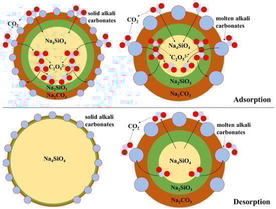 Schematic illustration of the CO2 sorption and desorption pathway for the Na4SiO4 mixed alkali carbonates.