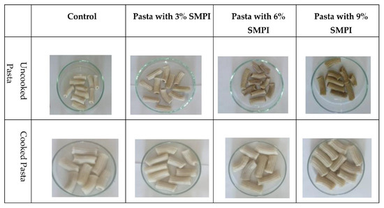 | Pasta with 9% SMPI | 44.50 ± 0.40 d | 51.11 ± 0.17 d | 7.99 ± 0.02 a | 6.11 ± 0.19 a | 26.17 ± 0.88 a | 33.10 ± 0.48 a |