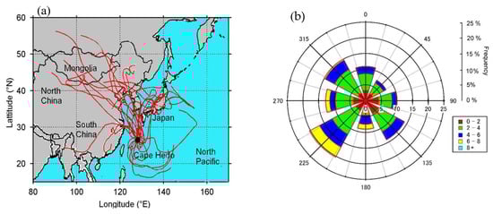 (a) Five-day back trajectory analysis using Hybrid Single-Particle Lagrangian Integrated Trajectory (HYSPLIT4) model (Draxler and Hess, 2003). (b) Wind direction recorded in Okinawa during study period. Color code labels in rose plot (0–2, 2–4, etc.) indicate the recorded wind speed in m/s. The meteorological data were obtained from the Japan Meteorological Agency.