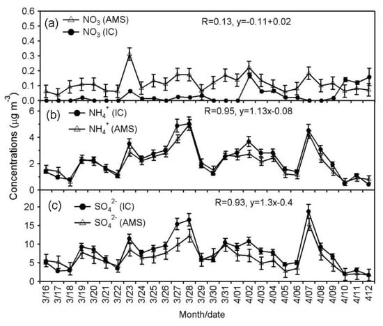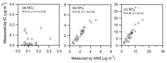 Scatterplots of (a) NO3−, (b) NH4+ and (c) SO42− measured by two instruments (IC and AMS) in aerosols collected from Cape Hedo, Okinawa.