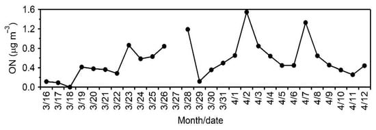 Inorganic and organic nitrogen compounds are present abundantly in the atmosphere and contribute to the total atmospheric nitrogen budget [,,,,]. The nitrogen deposition in aerosols mainly emphasizes only the inorganic fraction (i.e., NH4+ and NO3−) []. Recently, more studies on organic nitrogen (ON) can constitute a significant fraction of total (inorganic + organic) nitrogen in ambient aerosols [,,,].