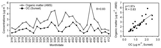 We compared OMAMS and organic carbon (OC) data obtained from the campaign, where OMAMS represents the concentration of organic matter measured by AMS, whereas OC was measured by Sunset Laboratory carbon analyzer. As shown in Figure 6, temporal variations of OMAMS and OCSunset are similar. A strong correlation (0.83) is found between OMAMS and OCSunset (Figure 6). The mass concentrations of OMAMS ranged from 1.0 to 5.9 μg m−3 (av. 2.5 ± 1.2 μg m−3), whereas those of OC ranged from 0.41 to 2.5 μg m−3 (1.2 ± 0.59 μg m−3). OMAMS is 1.6–3.6 times more abundant than OC, which is expected because organics contain several elements (H, O, N, S, etc.) other than C. Turpin and Lim. [] estimated the OM/OC ratio to be 1.6 ± 0.2 for fresh urban aerosols and to be 2.1 ± 0.2 for aged aerosols. Okinawa aerosols are significantly aged during long-range atmospheric transport from East Asia [,,,,].