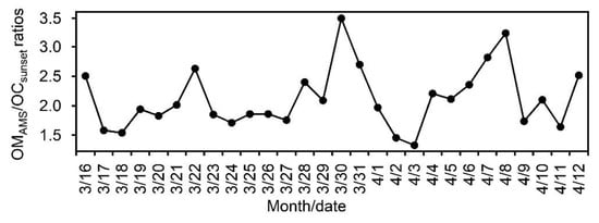 Figure 7 shows the temporal variation of OMAMS/OCsunset ratios. The higher ratios were obtained in March 31 (3.5) and April 8 (3.3). We checked the air mass trajectory to identify the source regions. We found that air masses of March 31 and April 8 came from South Asia and oceanic regions. Trimonen et al. [] reported OM/OC ratios of 1.5 to 2.1 for oxygenated aerosols. OM to OC ratios were reported to be 1.3–1.5 for primary OA and 1.8–2.2 for secondary OA []. Aiken et al. [] showed a high OM/OC ratio (2.5) for aged, oxygenated OA. The high variability of OM/OC in our study as compared to previous studies suggests that OA are often photochemically more aged in the western North Pacific Rim. A very high OMAMS/OC ratio (3.8) was reported in Cape Hedo, Okinawa, in December 2010 []. However, the average OM/OC ratio (2.1 ± 0.5) obtained in our study is consistent with the ratio (2.1 ± 0.2) reported for aged aerosols [].