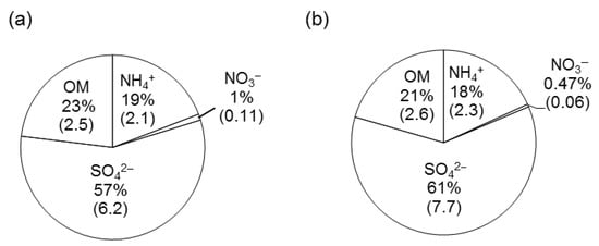 The molar ratio of ammonium to sulfate is generally less than 2, and sometimes less than 1. SO42− is present as a mixture of (NH4)2SO4 (molar ratio = 2) and NH4HSO4 (molar ratio = 1) and H2SO4 (molar ratio = 0). In this study, the average molar ratio of NH4+ to SO42− is 1.14. Thus, the major chemical state is NH4HSO4. Deliquescence point of NH4HSO4 is 40% relative humidity (RH) at 25 °C []. In Okinawa, RH of ambient air was in between 40 and 87% and RH at the inlet of Q-AMS was between 17.2% and 69.1%. Thus, we consider that NH4HSO4 is present as liquid phase and that CE for liquid phase aerosols is 1 []. Therefore, aerosols that are measured in Okinawa during the study period mainly exist as liquid phase and thus CE = 1 is suitable. CE = 1 is used for all the species.