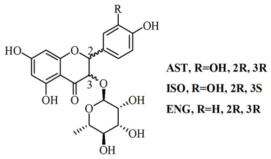 Astilbin (AST), isoastilbin (ISO) and engeletin (ENG) are flavonoids with similar structures (Figure 1) in RSG, of which AST is the index for determining the quality of RSG because of its highest content [10,11]. The content of AST in RSG shall not be less than 0.45% according to the Chinese pharmacopoeia [3]. Recent reports confirmed that AST has broad and varied biological activities including antioxidant, antidepressant, antimicrobial and insecticidal, immunosuppressive, anti-inflammatory, and anti-diabetic activities, without any obvious toxicity [11,12,13,14]. It has been reported that ENG can relieve osteoarthritis in vivo, and attenuate oxidative stress and neuroinflammation [15,16]. ISO also showed strong antioxidant and anti-inflammatory activities [17]. Due to the diverse pharmacological activities of flavonoids in RSG, it is necessary to develop an effective preparation method for purifying these flavonoids with high purity, especially those with low content.