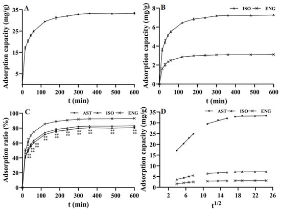 Adsorption kinetics curves of AST (A), ISO, and ENG (B); relative adsorption capacities in the whole adsorption process of the three flavonoids (** p < 0.01 compared with ENG) (C); intraparticle diffusion kinetic models of AST, ISO, and ENG (D).