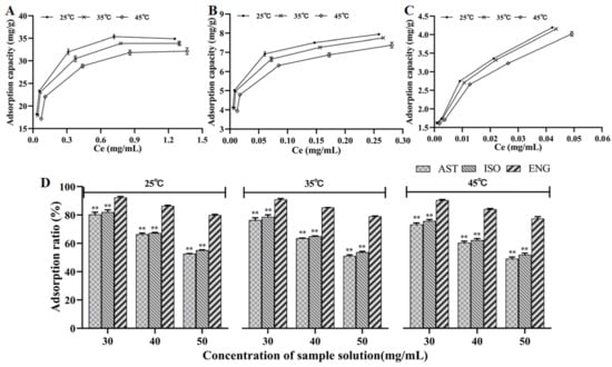 Adsorption isotherms of AST (A), ISO (B), and ENG (C); relative adsorption capacities of the three flavonoids at different temperatures and concentrations (** p < 0.01 compared with ENG) (D).