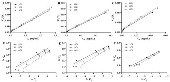 Langmuir models of AST (A), ISO (B), and ENG (C); Freundlich models of AST (D), ISO (E), and ENG (F).