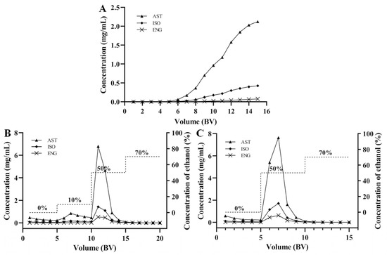 The leakage curves of the three flavonoids were drawn by dynamic adsorption tests when the concentrations of AST, ISO, and ENG were 2.22, 0.49, and 0.18 mg/mL, respectively. Generally, the leakage point is considered to be reached when the sample concentration in the effluent reaches 1/10 of the sample concentration. As shown in Figure 5A, the leakage points of AST and ISO were 8 BV, while that of ENG was 10 BV. The leakage point of ENG appeared later than those of the other two compounds, indicating that it showed the strongest competitive adsorption capacity in both static and dynamic adsorption experiments. In order to improve efficiency and avoid sample waste, the sample loading volume was selected as 7 BV.