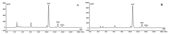 A Thermo Fisher U3000 system equiped with a H&E SP ODS-A column (4.6 × 250 mm, 5 μm) was employed for determining the concentrations of AST, ISO and ENG. 291 nm was selected as the detection wavelength. The injection volume was 20 μL. The mobile phase A was 0.1% phosphoric acid and B was methanol. The flow rate was 1 mL/min. The gradient elution procedure was as follows: 0–15 min: 40–55% solvent B, 15–16 min: 55–75% solvent B, 16–18 min: 75–80% solvent B, 18–19 min: 80–100% solvent B. The column temperature was set to 25 °C. According to the above method, the standard curves were established for the three standards and the retention times were 10.605, 12.925, and 13.982 min for AST, ISO, and ENG, respectively. The standard curves (Figure S1) of AST, ISO, and ENG were Y = 0.7601X + 1.6056 (R2 = 0.9995), Y = 0.6558X + 0.5913 (R2 = 0.9997), and Y = 0.7673X − 0.0875 (R2 = 0.9999), respectively, where Y stood for peak area and X was the concentration (µg/mL).