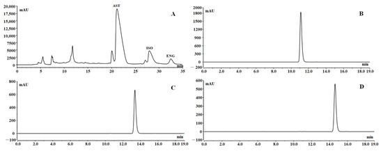 Preparative HPLC chromatogram (A); chromatograms of the final prepared AST (B), ISO (C), and ENG (D).