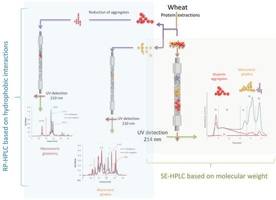Chromatographic techniques, SE-HPLC and RP-HPLC, were used to separate and quantify the different classes of durum wheat storage proteins. RP-HPLC was carried out to separate and quantify the proteins on the basis of their hydrophobicity and to distinguish between the different classes of glutenins (HMW-GS and LMW-GS) and gliadins (ω-, α/β-, and γ-gliadins). SE-HPLC was used to separate and quantify glutenin polymers and monomeric proteins (albumins/globulins and gliadins) (Figure 2).
