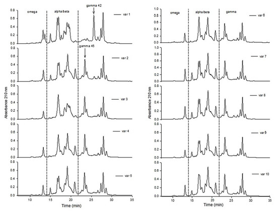 Thus, for gamma gliadins (Figure 3), all varieties except variety 1 (gamma 42) are of type gamma 45.