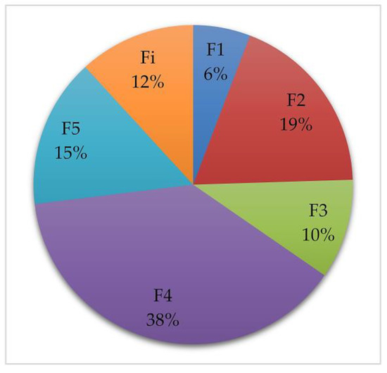 The average repartition of the different protein fractions is represented in Figure 5. As expected, the major part (38% on average) of the proteins present in the grains are α-, β-, and γ-gliadins (F4 fraction), followed by an almost equal proportion (between 15 and 19%) of small glutenin aggregate proteins (F2), albumins, and globulins (F5) (Figure 5). The percentage of Fi (insoluble proteins) is of the same order as that of F3 (ω-gliadins and high molecular weight albumins).