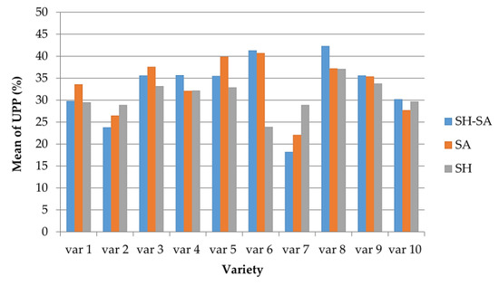 Mean of UPP (%) by variety and environment. SH-SA: suhumid-semiarid, SA: semiarid, and SH: subhumid.