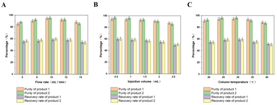 The flow rate was one of the main factors affecting the purification of the two products by preparative high-performance liquid chromatography. We evaluated the effect of the flow rate on the purity and recovery rate of the two products. Flow rates of 5 mL/min, 8 mL/min, 10 mL/min, 12 mL/min, and 15 mL/min were tested. As shown in Figure 1A, after comparing the purity of the two products at different flow rates, we found that when the flow rate was 10 mL/min, the purity and recovery rate of the two products reached the maximum value. Therefore, the best flow rate was 10 mL/min. Increasing the flow rate is a very effective way to improve the yield, because it can shorten the cycle of preparative HPLC. However, when the flow rate increased to more than 10 mL/min, due to the control of the diffusion resistance of the stationary phase, the capacity of the separation column decreased, and the peaks of the components lengthened and overlapped, resulting in a reduction in the separation effectiveness [62]. On the other hand, the increase in flow rate also means the use of more mobile phases, resulting in the waste of reagents. When the flow rate is too low, the separation time can be increased, and it takes 60 min to complete an elution unit (flow rate was 5 mL/min), which means that the preparation efficiency decreases and a lot of reagents are consumed for Prep-HPLC. Therefore, in this study, the further optimized range of flow rate was found to be 8–12 mL/min.