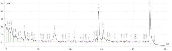 Waters Xevo G3 QTOF electrospray ionization-high resolution mass spectrometry (ESI-HRMS, Milford, MA, USA) was used to identify the purified product [61], and the gradient elution procedure was set as follows: Agilent ZORBAX RRHD SB-C18 column (100 mm × 2.1 mm, 1.8 μm, column temperature 30 °C). The detection wavelength was 227 nm. The constant flow rate was 0.8 mL/min, the injection volume of the sample was 5 μL, mobile phase A was purified water, and B was acetonitrile. Gradient elution procedure: B increased from 40% to 50% at 0–10 min, and B increased from 50% to 53% at 10–13 min. B increased from 53% to 73% at 13–25 min, and at 25–30 min, B decreased from 73% to 40% for 10 min, which was consistent with HPLC. Mass spectrometry electrospray ionization source (ESI), in positive ion mode: mass scanning range: m/z 100–1500; spray voltage: 3500 V; ion source temperature: 350 °C.