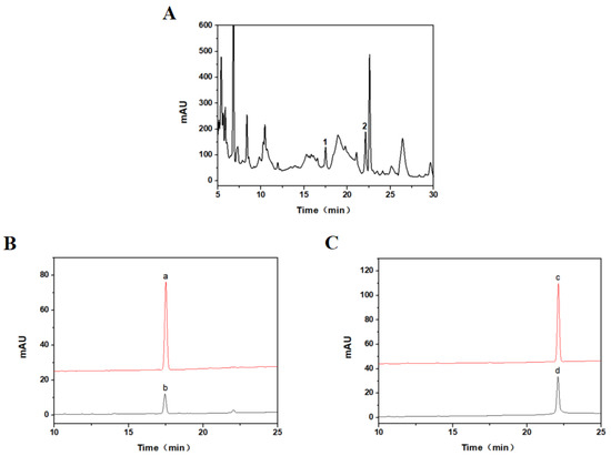 Figure 4A shows the HPLC diagram of Taxus cuspidata extract. It can be seen from the diagram that the components of Taxus cuspidata extract were complex, in which compound 1 was 10-DAT and compound 2 was paclitaxel (PTX). In Figure 4B, compound a (Figure 4B(a)) was the standard of 10-DAT and compound b (Figure 4B(b)) was the purified product 1. The peak time of the two products was the same, and they were preliminarily judged to be the same substance. In Figure 4C, compound c (Figure 4C(c)) was the standard product of paclitaxel, and compound d (Figure 4C(d)) was the purified product 2. The peak time of the two compounds was the same, and it was preliminarily judged that they were the same substance.