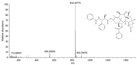 As shown in Figure 5, the accurate mass-to-charge ratio of target molecular ions was 834.30775 in ESI-HRMS positive ion mode. Compared with the standard spectrum library, the theoretical value of C45H49NO13 was 834.3204, and the relative error was only 0.01265 (p < 0.05). Therefore, in the positive ion mode, the molecular formula of the mass spectrum peak m/z 834.30775 should be C45H49NO13, and the substance was 10-deacetyltaxol (10-DAT) in combination with the experimental conditions.