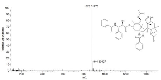 As far as we know, the structural detection methods of taxanes include mass spectrometry, nuclear magnetic resonance (NMR), and matrix-assisted laser desorption time-of-flight mass spectrometry [51]. Among them, mass spectrometry is an analytical method to measure the charge–mass ratio of ions, which can be used to analyze isotopic composition, organic structure, and elemental composition. Mass spectrometry can provide abundant structural information in one analysis, and the combination of separation technology and mass spectrometry is a breakthrough in the scientific method of separation. Although there are many kinds of drugs determined by HPLC, the qualitative reliability is poor. However, mass spectrometry is accurate and rapid with only a few samples without complicated pretreatment. Mass spectrometry has been widely used in food, biology, environment, biopharmaceuticals, and other fields. It is expected that mass spectrometry will become the most powerful tool for drug detection [52]. Electrospray ionization-high resolution mass spectrometry (ESI-HRMS) is one of the main techniques of mass spectrometry. Its advantages are rapidness, high sensitivity, strong matrix tolerance, etc. It has been applied to detect polyphenols and amino acids in honey [53], novel fentanyl analogs [54], and the speciation distribution of molybdate and halides (Cl, F, and Br) in interaction [55].