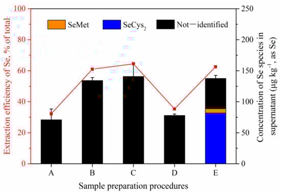 Extraction efficiency of Se and concentration of Se species in supernatant with different preparation procedures: (A) Extraction with ultrapure water; (B) Extraction with HCl (0.1 M); (C) Extraction with NaOH (0.1 M); (D) Extraction with 20 mM ammonium acetate solution containing 5% of methanol (v/v); (E) Hydrolysis with protease XIV. The value of Se in supernatant minus the observed Se species was defined as the “not-identified” Se species.