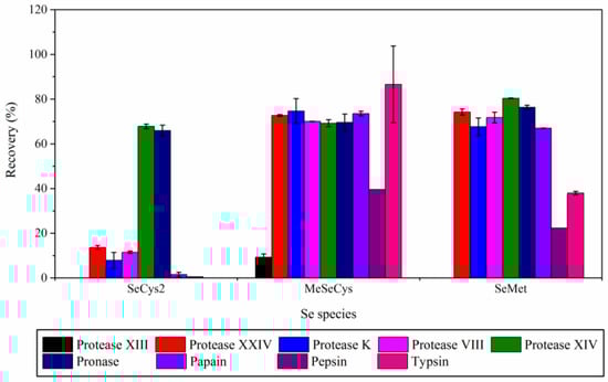 Recently, the common proteases developed in market are mainly animal-derived proteases, plant-derived proteases and microbial-derived proteases. According to previous studies, this work selected animal-derived proteases (pepsin and trypsin), plant-derived proteases (papain), and microbial-derived proteases (protease XIII, protease XXIV, protease K, protease VIII, protease XIV, and pronase) to evaluate the extraction of Se species in liquid whole egg [2,21,22,23]. The spike recoveries of three Se species in system with different enzymes were shown in Figure 2.