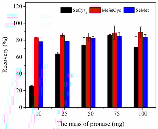Optimization of enzyme usage was performed to find out the optimal Sample/Enzyme ratio in extraction step. Three Se species in egg sample were extracted using 10.0 mL of 100 mM Tris HCl (pH 7.5) containing varying amounts of pronase (10, 25, 50, 75, and 100 mg) for 18 h. As shown in Figure 3, the spike recoveries of SeCys2 and SeMet increased with increasing the amount of pronase (10–75 mg). When the amount of pronase reached to 100 mg, the spike recoveries of SeCys2 and SeMet were decreased compared to those of 75 mg pronase system. And the maximum spike recoveries were obtained under the system containing 75 mg of pronase. On the contrary, the spike recovery of MeSeCys did not change obviously with the amount of pronase increasing.