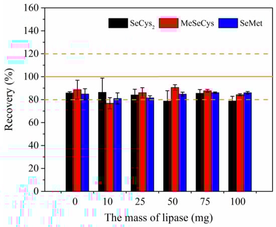 As shown in Figure 4, the spike recoveries of Se species were affected by lipase usage slightly. The average spike recoveries of Se species were 83.2 ± 3.5%, 85.7 ± 4.8%, and 84.0 ± 2.2% for SeCys2, MeSeCys, and SeMet, respectively. The spike recoveries of three Se species were optimum in the system with 75 mg of lipase (Recovery > 80% and RSD < 5%), as shown in Figure 4. And in this condition, more Se species extracted from unspiked sample were obtained. The concentration of SeCys2 was 90.79 ± 5.29 μg kg−1, and the concentration of SeMet was 17.14 ± 0.95 μg kg−1. A mixture of 75 mg pronase and 75 mg lipase was selected as the optimal usage of enzyme in further experiments for 2.5 g of liquid whole egg sample. With the addition of lipase, the supernatant of samples became clearer after enzymatic hydrolysis procedure. It was indicated that egg sample underwent a higher extent of enzymatic hydrolysis. The use of lipase made the supernatant easier to filter through 10.0 kDa ultrafiltration membranes.