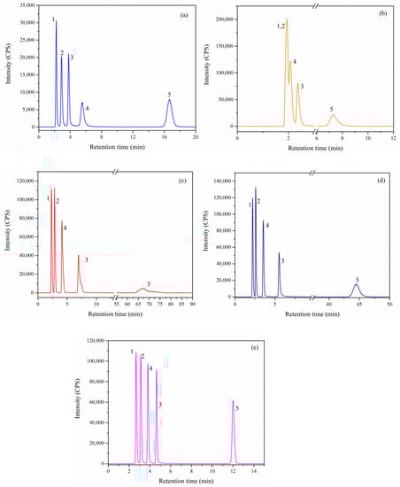 Chromatograms of a mixture of Se species at 500 μg L−1 (as Se) in solution on anion-exchange column ((a) Hamilton PRP X-100 (4.1 mm × 250 mm, 10 μm)) and reversed-phase columns ((b) Agilent Extend C18 (4.6 mm × 250 mm, 5 μm)); (c) Agilent Eclipse XDB C18 (4.6 mm × 250 mm, 5 μm); (d) Agilent Eclipse Plus C18 (4.6 mm × 250 mm, 5 μm); (e) Agilent SB-Aq (4.6 mm × 250 mm, 5 μm)). The peaks of five Se species in chromatograms were (1) SeCys2, (2) MeSeCys, (3) Se(IV), (4) SeMet, and (5) Se(VI).