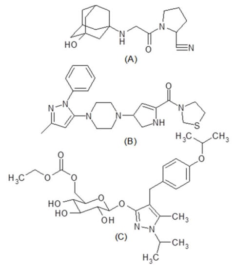 Chemical structure of vildagliptin (A), teneligliptin (B), and remogliflozin etabonate (C).