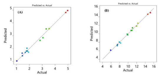 As indicated by the Design Expert program, the effect of variable parameters on the resolution was described as a polynomial equation with the quadratic model (Equation (1))