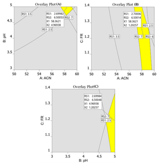Overlay plots for optimum chromatographic conditions suggested by the Design-Expert software. The perctentage of acetonitrile against pH of mobile phase (A); flow rate against % of acetonitrile (B); flow rate against pH of the mobile phase (C).