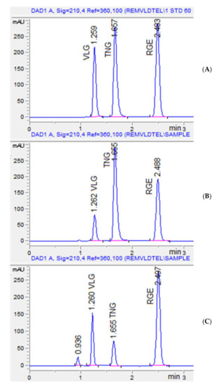 Representative chromatograms for standard (A), VLG + RGE formulation with IS TNG (B), and TNG+ RGE with IS VLG (C). The retention time of VLG was 1.26 min, TNG: 1.65 min, and RGE: 2.48 min. The peak at 0.936 is Ferric oxide yellow present in the TNG tablet coating.