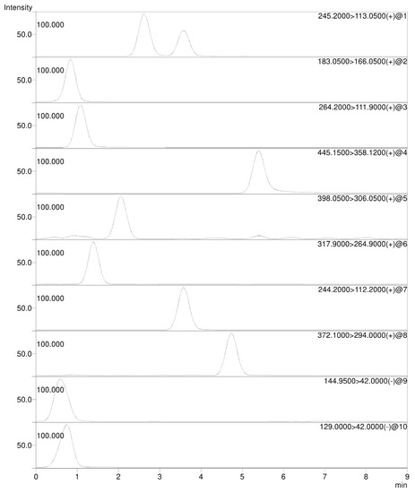 To evaluate the void time needed to calculate the retention factor (k), the dimensions of the water layer adsorbed on the surface of HILIC-Z stationary phase had been taken into account. For this purpose, an analyte that is not retained with normal phase chromatography, such as toluene, has been tested [25]. The toluene 5 mg/mL solution was thus evaluated utilizing the final MRM analysis mobile phase as solvent, which is ACN 90%, H2O 10% with 20 mM ammonium formate. Ten injections were repeated to establish the retention time of the unretained analyte. Toluene was detected at a wavelength of 254 nm by a photodiode array detector (PDA).