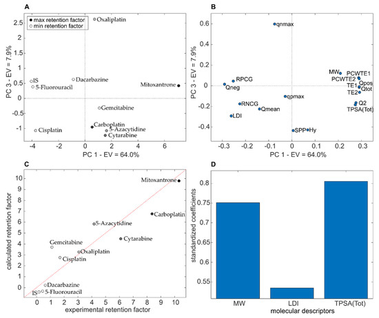 The results of OLS regression analysis on the same data set are reported in Figure 2C,D, which show the experimental versus predicted retention factors and the standardised coefficients of the regression model based on three molecular descriptors (MW, LDI and TPSA), respectively.