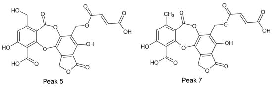 According to our search on SciFinder, the compounds identified with peaks 5 and 7 are reported here for the first time. As mentioned above, fumarprotocetraric acid display considerable pharmacological activity. Therefore, these two compounds could be isolated to evaluate their potential as pharmacological agent.