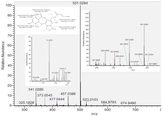 Peak 5 provided an [M–H]− ion at m/z 501.0284 (C22H13O14). This fragmentation indicated that peak 5 is a new compound related to fumarprotocetraric acid (peak 13). The key for this proposal implied the presence of the residue butendioic acid (C4H3O4—; 115.0023) along with the residue C17H9O8— (341.0303). Considering that peak 5 showed UV absorbance at λmax 215, 248 and 315 nm, which is similar to the one of peak 13 (λmax 212, 238, 314 nm), and according to biosynthetic considerations, we tentatively identified peak 5 as hydroxy fumarprotocetraric acid lactone (Figure 2). Finally, the presence of fumarprotocetraric acid in Cladonia species supported this idea to be a derivative [17,18].