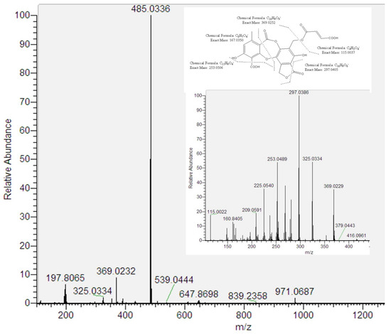 Peak 13 was detected as fumarprotocetraric acid (C22H15O12), which displayed an [M–H]− ion at m/z 471.0544. The fragmentation of this peak produced ions at m/z 355.0441, 311.0545 and 115.0023 according to reported [21]. This depside has been identified in Cladonia verticillata, C. cariosa, C. phyllophora, C. merochlorophaea, C. trassii, C. symphycarpia, C. subulata, C. pyxidata, C. fimbriata, C. chlorophaea and C. stricta from Poland samples [18]. Fumarprotocetraric acid has considerably shown antimicrobial, antioxidant, anticarcinogenic and immunoestimulatory activities [4,5,6,7].