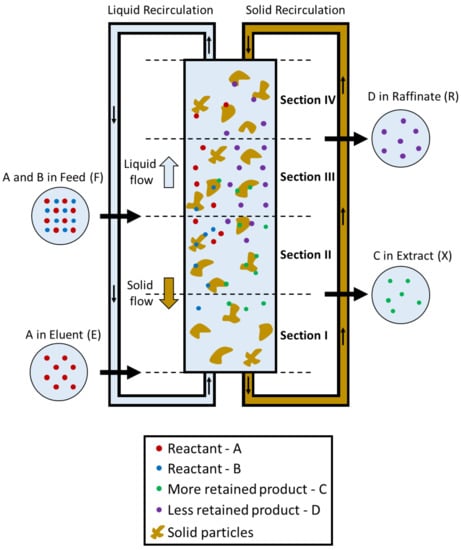 Traditionally reaction and product purification are carried out in independent units. Multifunctional processes deal with reaction and separation in a single unit; therefore, they are more cost-effective and environmentally safe []. Simulated Moving Bed Reactor (SMBR) stands out among multifunctional units due to its efficiency in dealing with equilibrium-limited reactions. It has the capability of removing products from the reaction zone through selective adsorption onto porous catalyst, shifting the equilibrium toward products and, thus, increasing the yield [,,,]. Periodic switches change inlet (eluent and feed) and outlet (raffinate and extract) streams in a multicolumn system divided into four sections filled in with an adsorptive porous catalyst. The purpose of the SMBR is to simulate liquid and solid counter-current flow as in a True Moving Bed Reactor (TMBR), eliminating the solid flow since it is difficult to handle.