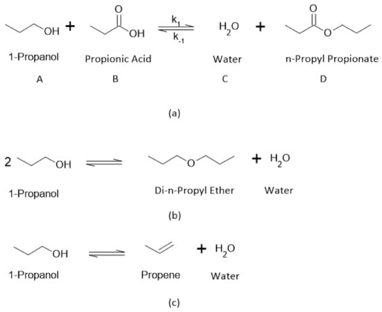 n-Propyl Propionate (ProPro) is an ecofriendly product applied in drugs and ink production, polymerization reactions, coating industry, and as an additive for food and perfume []. The U.S. Environmental Protection Agency considers ProPro a harmless air pollutant and it is acknowledged as a biodegradable and non-toxic product. It may be used as an additive for food and perfume due to its pleasant smell and absence of toxicity [,,]. ProPro can be synthesized by a heterogeneous esterification reaction of 1-propanol with propionic acid, also yielding water, as illustrated in Figure 2a. From this point on, and are the reactants 1-propanol and propionic acid, and and are the products’ water and n-propyl propionate, as in (1). and are the kinetic constants for the formation and consumption of ProPro, respectively. 1-propanol might also undergo secondary reactions such as etherification and dehydration, producing di-n-propyl ether and propene (Figure 2b,c, respectively) []. These side reactions are undesired due to economic and safety issues, as propene is an easily flammable gas []. In order to avoid these side reactions, Amberlyst 46 is employed as a heterogenous catalyst due to its ester prioritization and adsorption of water that shift the equilibrium toward products [].
