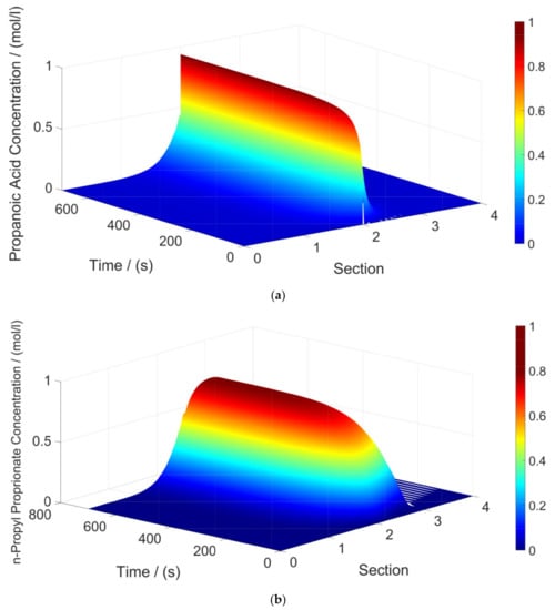 The results obtained for the optimal point are presented in Figure 3. It shows the concentration profiles along the columns and sections for propanoic acid, n-propyl propionate, and water singly in 3D graphics. In turn, Figure 4 shows the concentration profiles along the sections for the reactants and products together in a 2D graphic. It is worth observing that 1-propanol is the eluent and is not presented in Figure 3 and Figure 4. Its concentration is higher than the others and virtually does not change over time and sections. As it is possible observe from the concentration profiles that the unit can promote the separation of the product water from the reaction area (Section II), shifting the equilibrium to yield more n-propyl propionate. Therefore, this results in a reaction conversion close to 100%. Moreover, it is possible to observe that the ProPro is collected at the end of Section III with high purity, which agrees with Table 7.