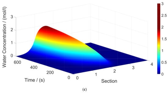 TMBR concentration profile along sections and time for (a) propanoic acid, (b) n-propyl propionate, and (c) water in a transient evolution.