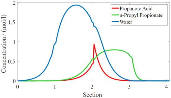 TMBR concentration profile for propanoic acid, n-propyl propionate and water along sections in the cyclic steady state.