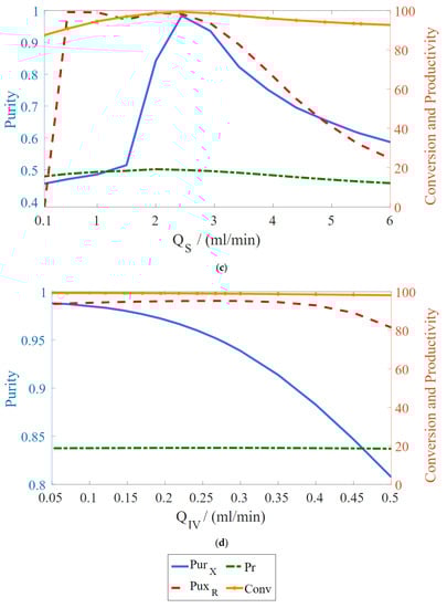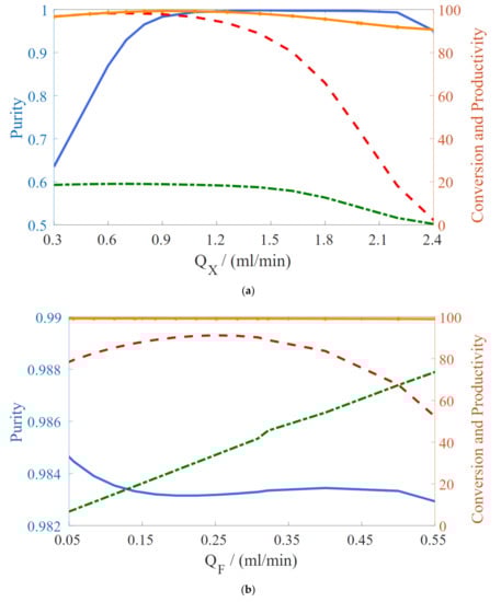 For the sake of performance assessment, changes in the operating condition were performed to analyze the process behavior, as shown in Figure 5. As observed, the extract and raffinate purities ( and ) are very sensitive to flow rate variations, except for variations on the feed flow rate. decreases with the increase in feed () and recycle () flow rates, whereas increases in extract () and solid () flow rates yield an increase in extract purity followed by a further decrease. Conversion () and productivity () do not change as much. As expected, productivity shows a significant increase as the feed flow rate increases and a drop as the solid flow rate increases.