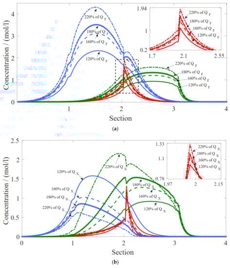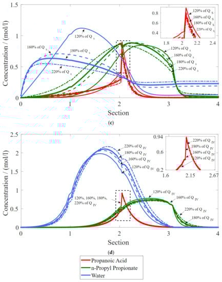 The behavior of Figure 3 and Figure 4 is explained by the analysis of the concentration profiles. Thus, the evaluation of the concentration profiles was also carried out with variations of the operating conditions, as shown in Figure 6. Reactants are fed between Section II and Section III, which justifies the higher concentration of propionate acid in Section II in Figure 6a–d. Pure water and ProPro must be removed, respectively, at the end of Section I and Section III. Any other compounds in these nodes means contamination in the extract and raffinate streams. Contamination of ProPro in the extract product can be observed in Figure 6a with the increase in extract flow rate. In other words, as the extract flow rate increases, the fluid flow rate in Section III and Section II decreases; therefore, not only water is carried with the solid toward the extract but also ProPro and the acid, and the reaction conversion is further reduced. An increase in feed flow rates in Figure 6b yields a higher concentration of products. Therefore, higher productivity. However, the water front starts to contaminate the raffinate stream. With the increase in solid flow rates in Figure 6c, the solid is not fully regenerated. Thus, the column is contaminated with the water dragged by the solid. In addition, the lighter components are also dragged by the solid. In turn, an increase in the recycle flow rates in Figure 6d does not affect the internal profile, which indicates that Section IV of the TMBR is more than enough to regenerate the eluent in the range studied.
